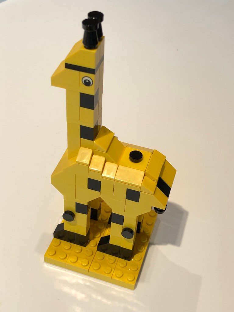 A giraffe I (may have) spent forty-five minutes makingOne of the Lego miniature models with references (left to right) to Friends, Castaway, Lord of the Rings, ET, and the BeatlesMe as a Lego minifigure (on the right)
