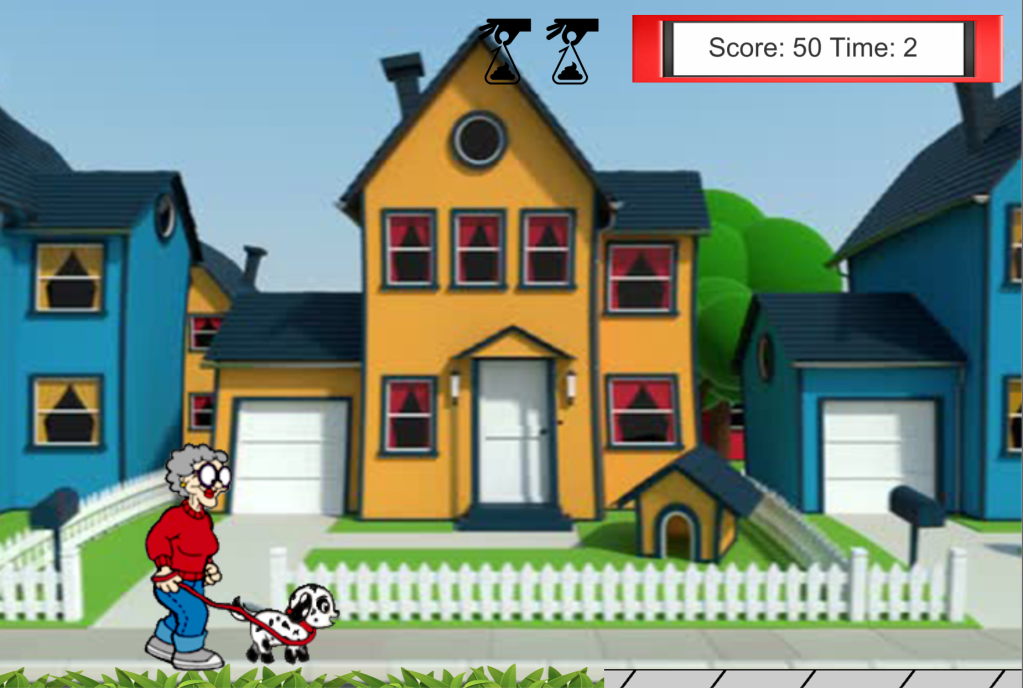 The game development process was a bit haphazard after this. We laid out a blueprint for everything we wanted in the game, tackled chunks of it individually until they were working, and ended up scraping the other half of the ideas we didn’t have time to implement. When it was all over, we definitely had a working prototype and a playable experience. Our game was based on the premise of a person walking their dog and trying to get the dog to go to the bathroom on the grass instead of the sidewalk or a crosswalk. The person and dog would walk forward and accelerate and decelerate based on the player’s input on the spacebar (hold to slow down, release to speed up). The ground that the person and dog were walking on would be either grass, sidewalk, or a crosswalk and a timer would count down the seconds until the dog was going to go to the bathroom again. Points are gained for poops on the grass and lost for poops on the sidewalk, with lives (shown as doggy bags) being lost for poops on the crosswalk.